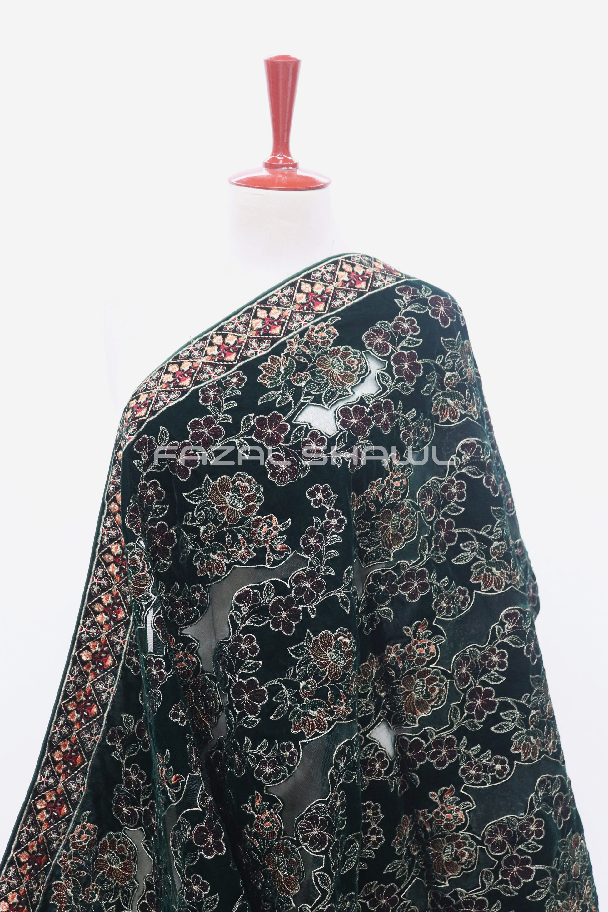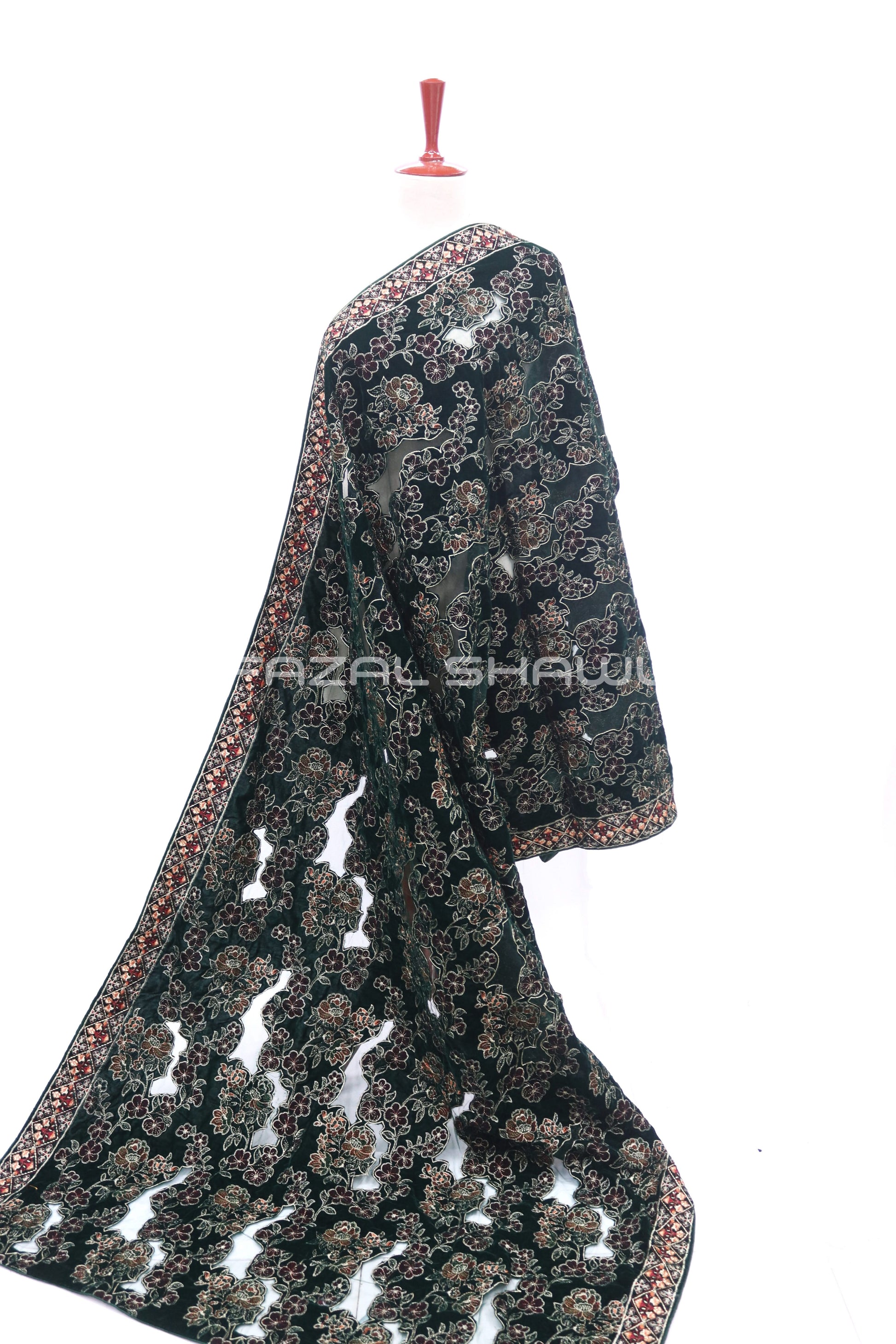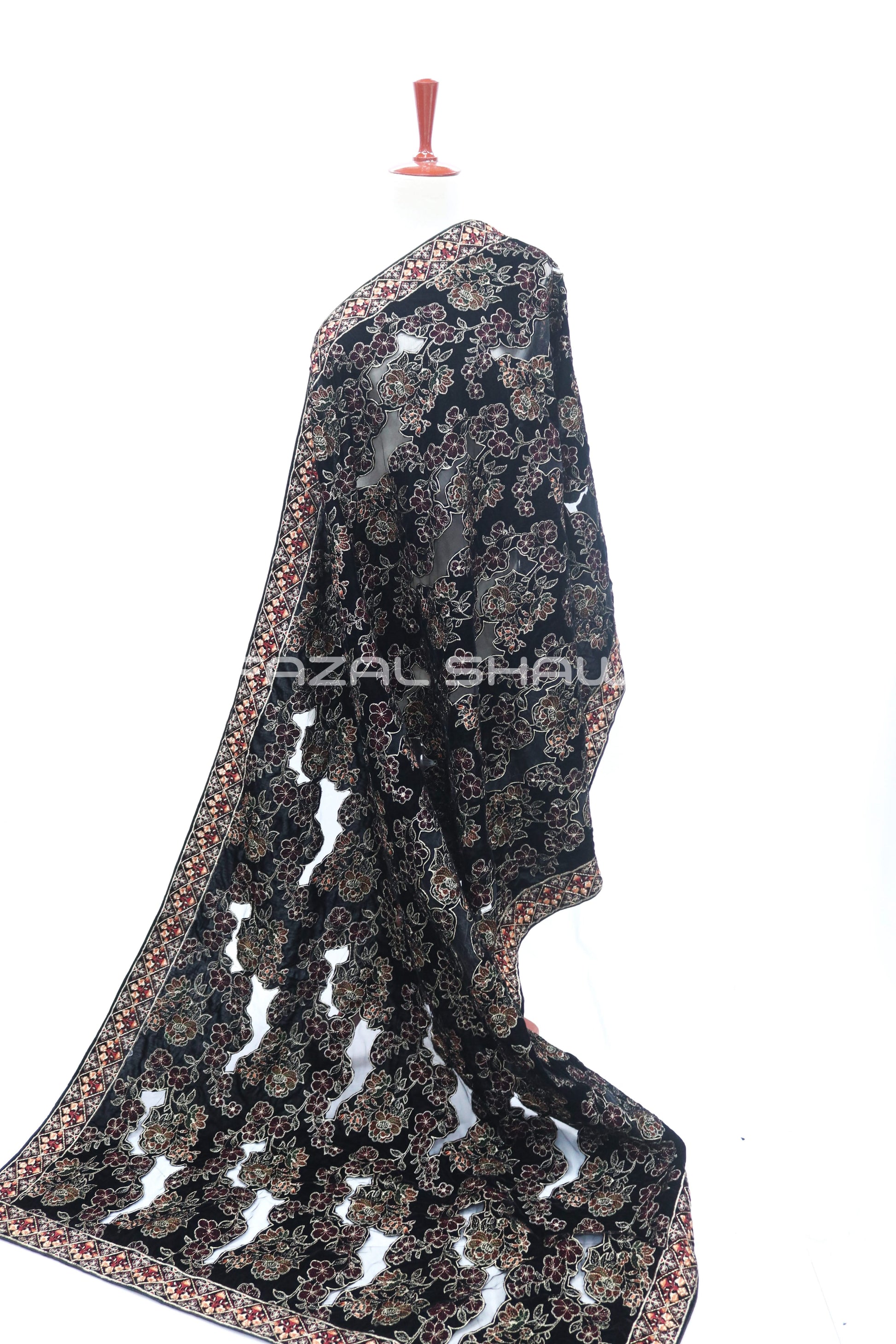 Wrap yourself in the richness of our Velvet Deanz Shawl, a luxe piece from Fazal Shawl. Crafted from plush velvet, it features Deanz-style embroidery (or details) along the borders and scattered motifs across the body. The soft velvet offers both warmth and elegance, while the embroidery adds texture and sophistication.