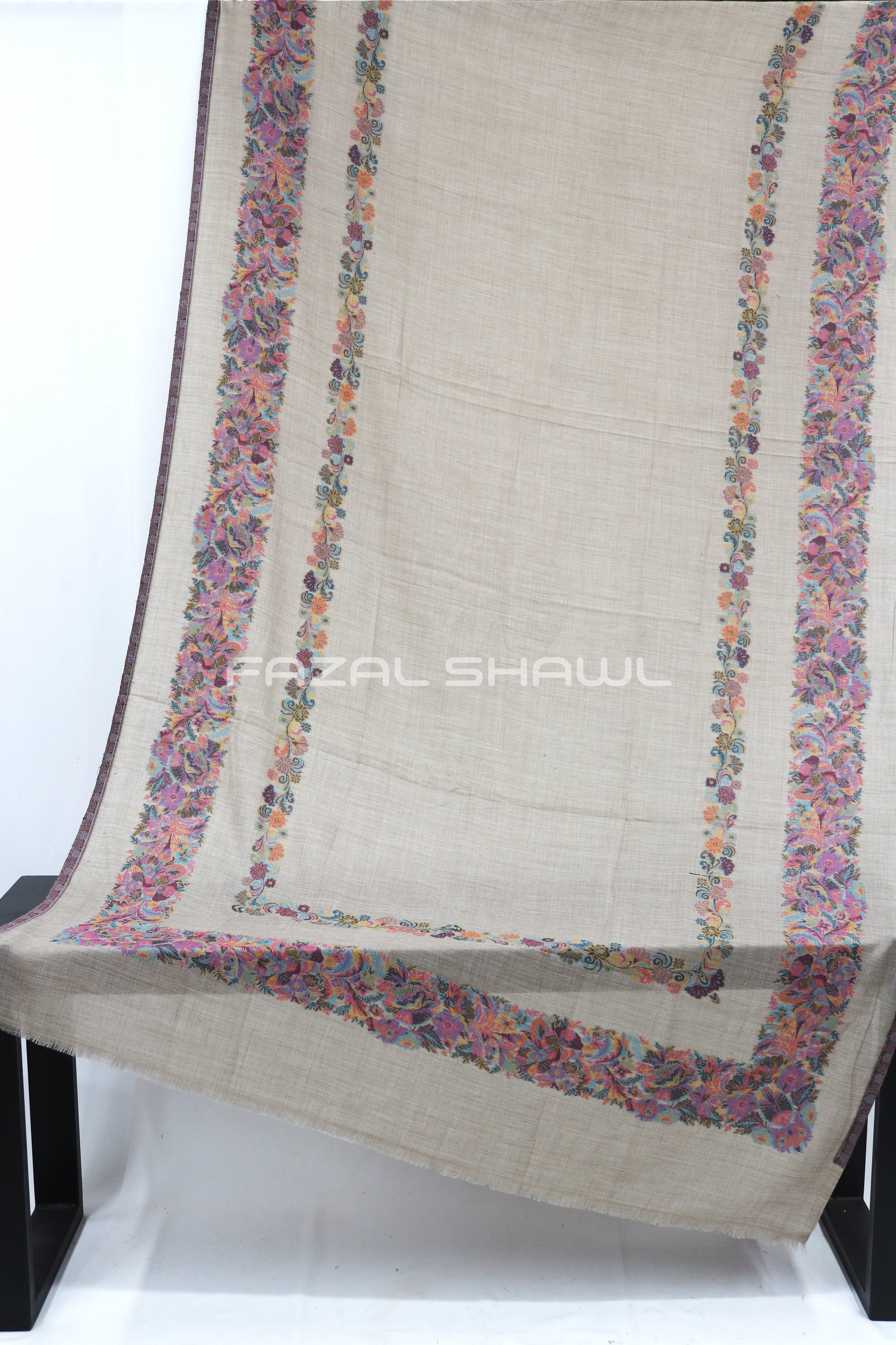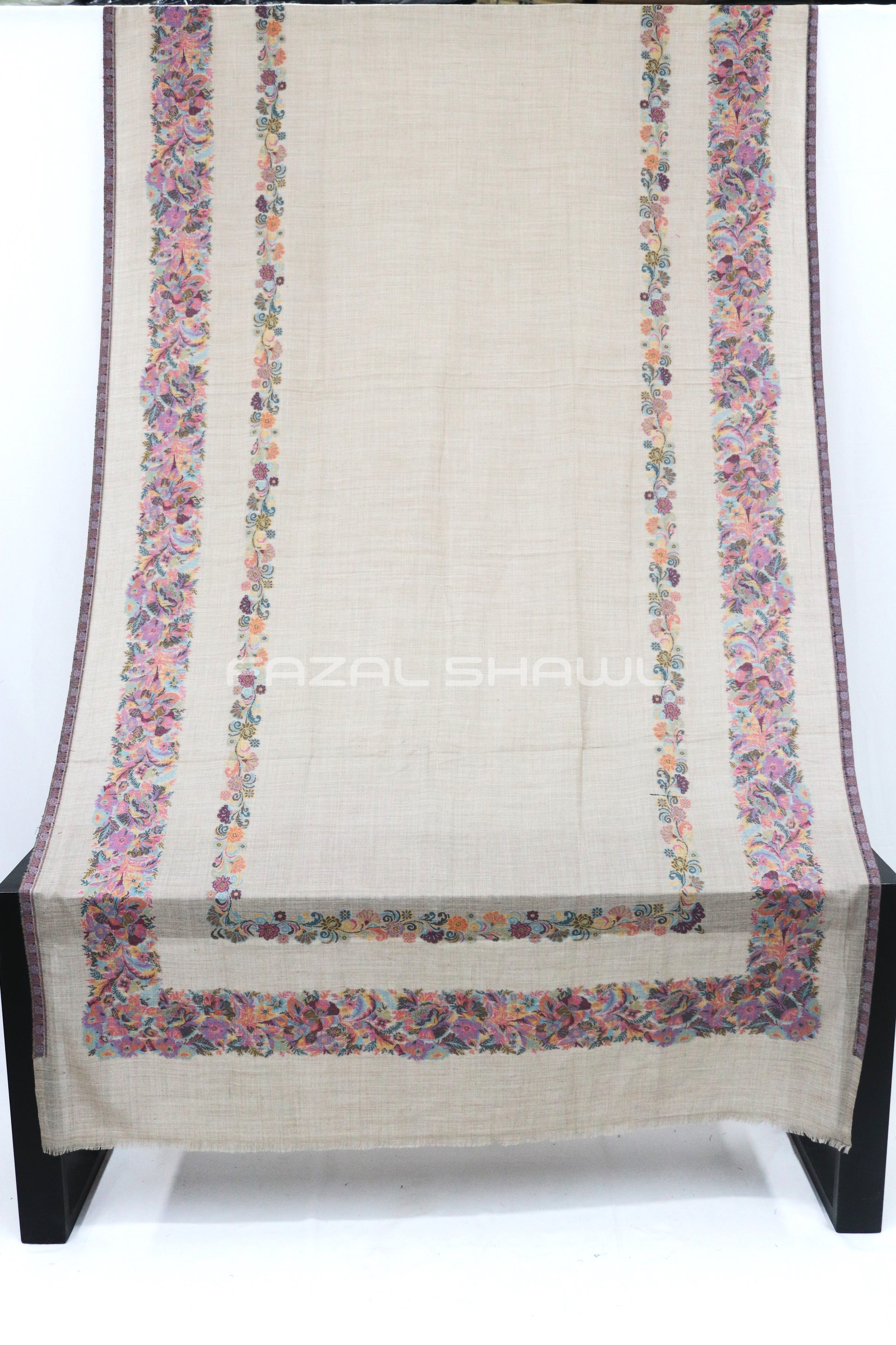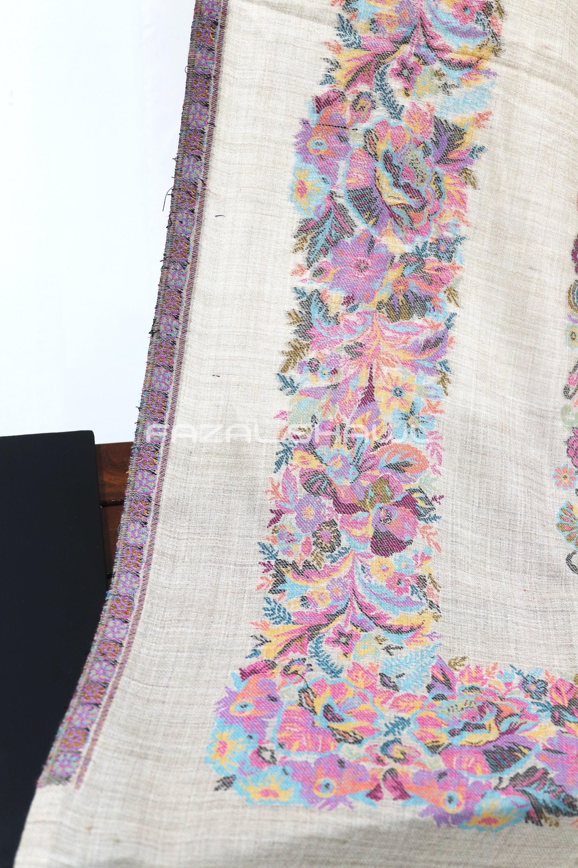 Expertly handwoven using the heritage Kani technique, this shawl features dual Kani borders—running along both the top and bottom edges (palla and base). Crafted with small wooden kanis, each motif is seamlessly woven into the fabric, not embroidered or printed, ensuring durability and authenticity.