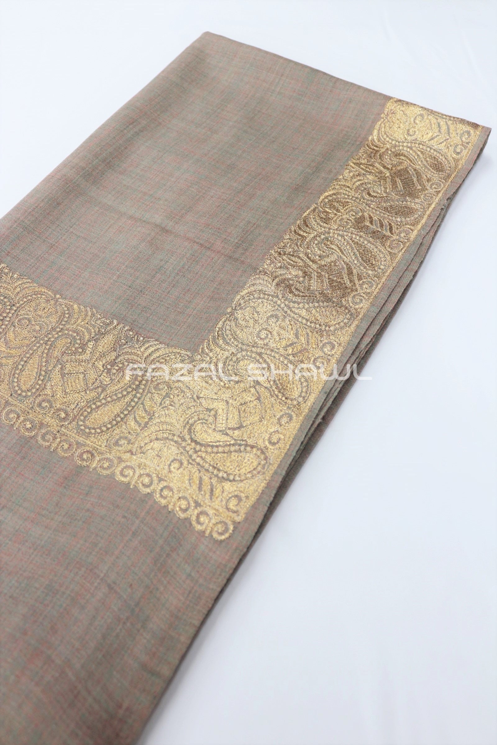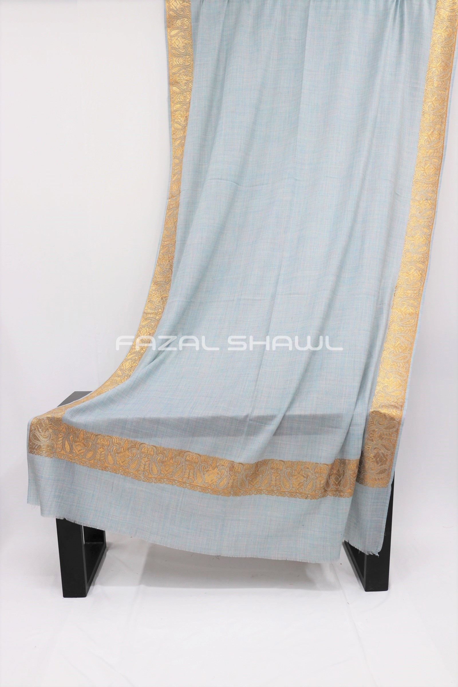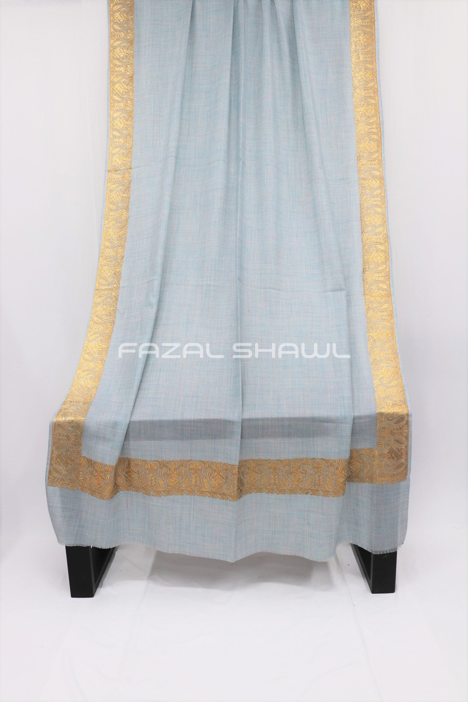 Border Size Is Four ( 4'') Inches On Four Side Border .Base is a Pashmina Wool. Computer Zari Border adds a modern, detailed grace, Fazal Shawl beneath creates a soft, elegant base. Together they blend tradition with tech-inspired art, A perfect fusion that sets your look apart.