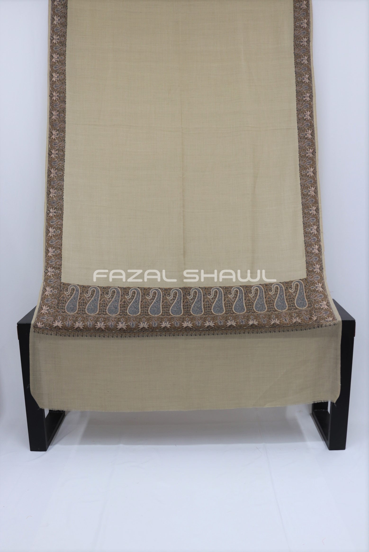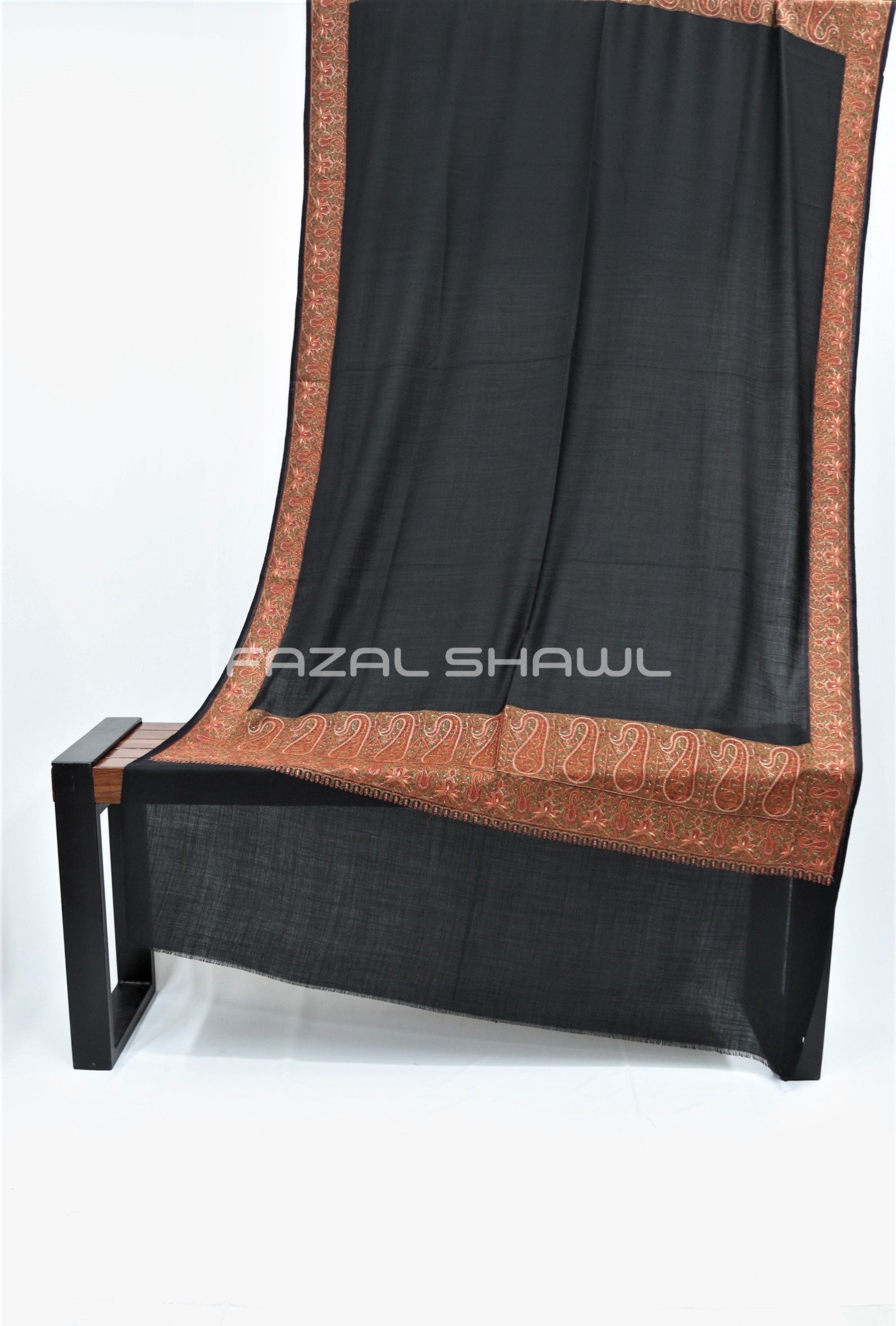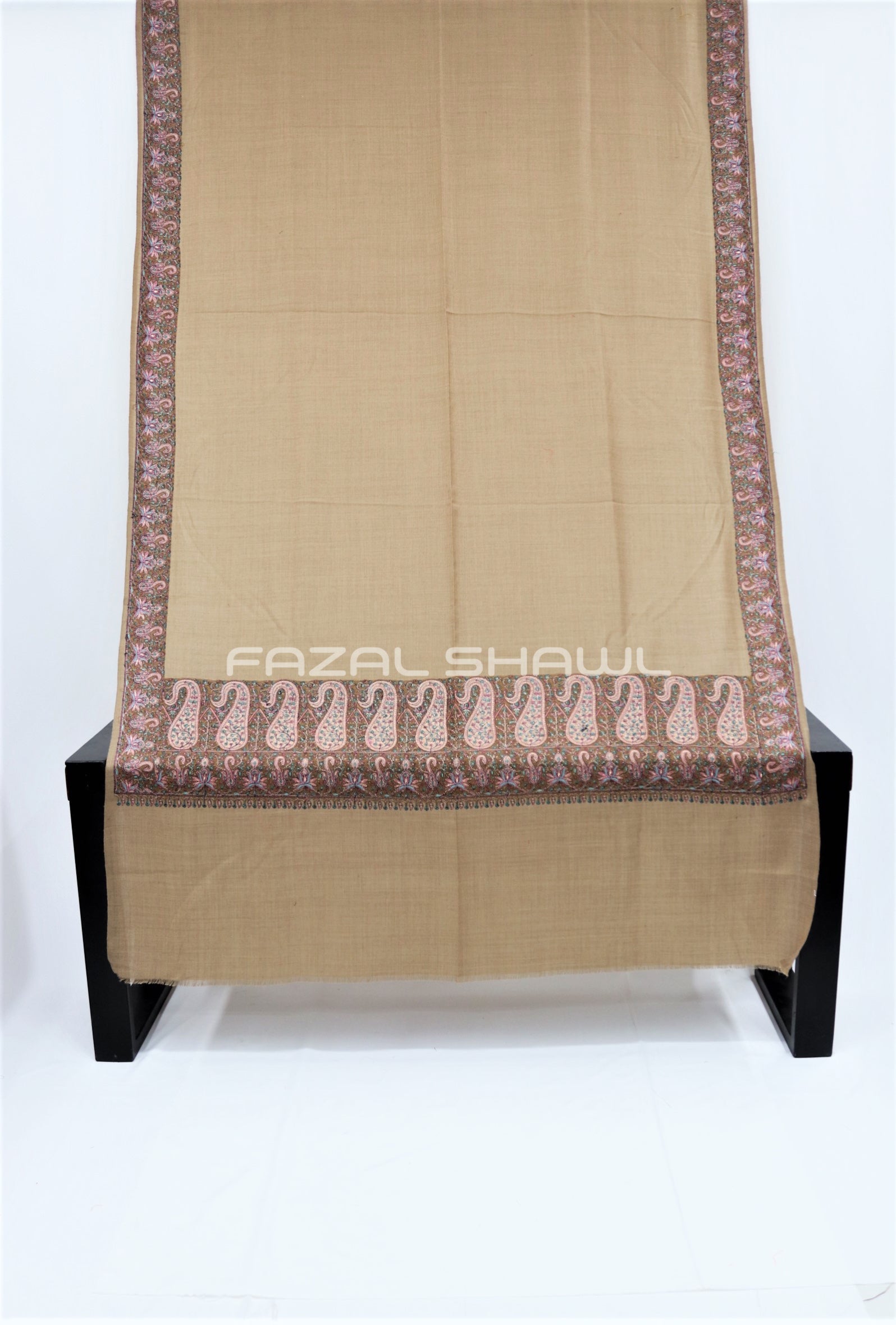 Border Size Is Four ( 4'') Inches On Four Side Border .Base is a Pashmina Wool. Multi Double Zari Border gleams with royal shine, Fazal Shawl beneath makes the look truly divine. A blend of richness with comfort so pure, Grace and tradition in a style that’s sure.
