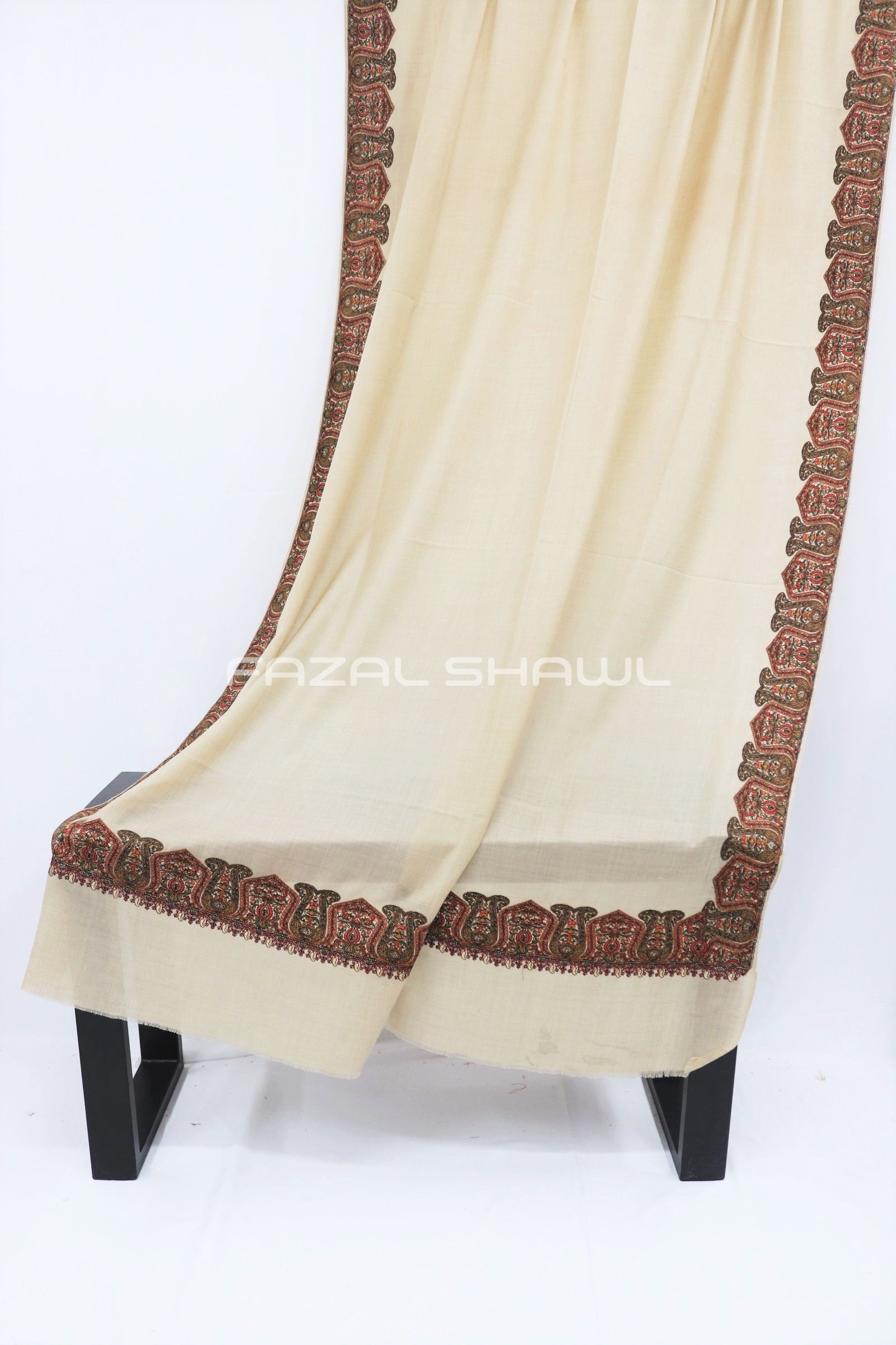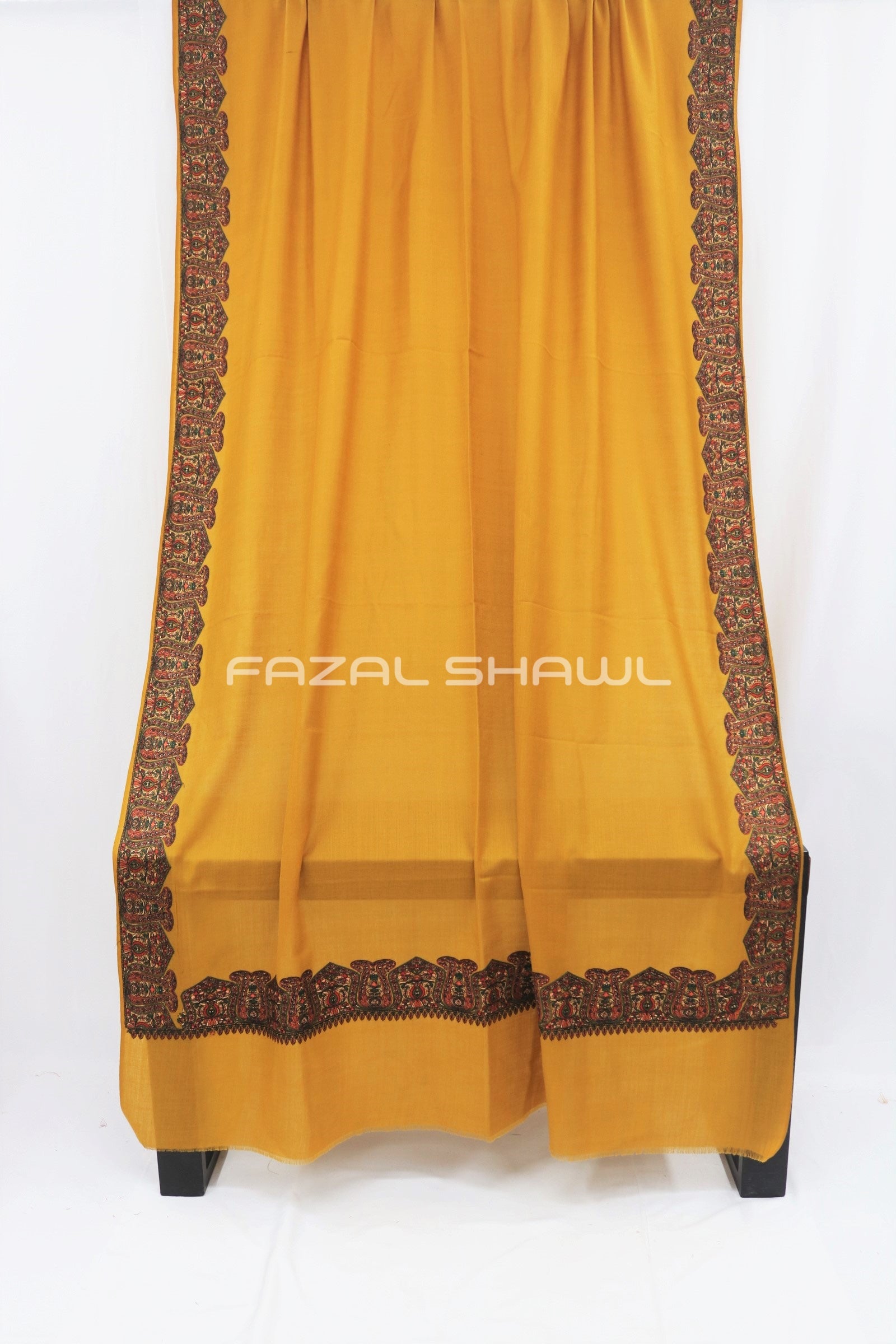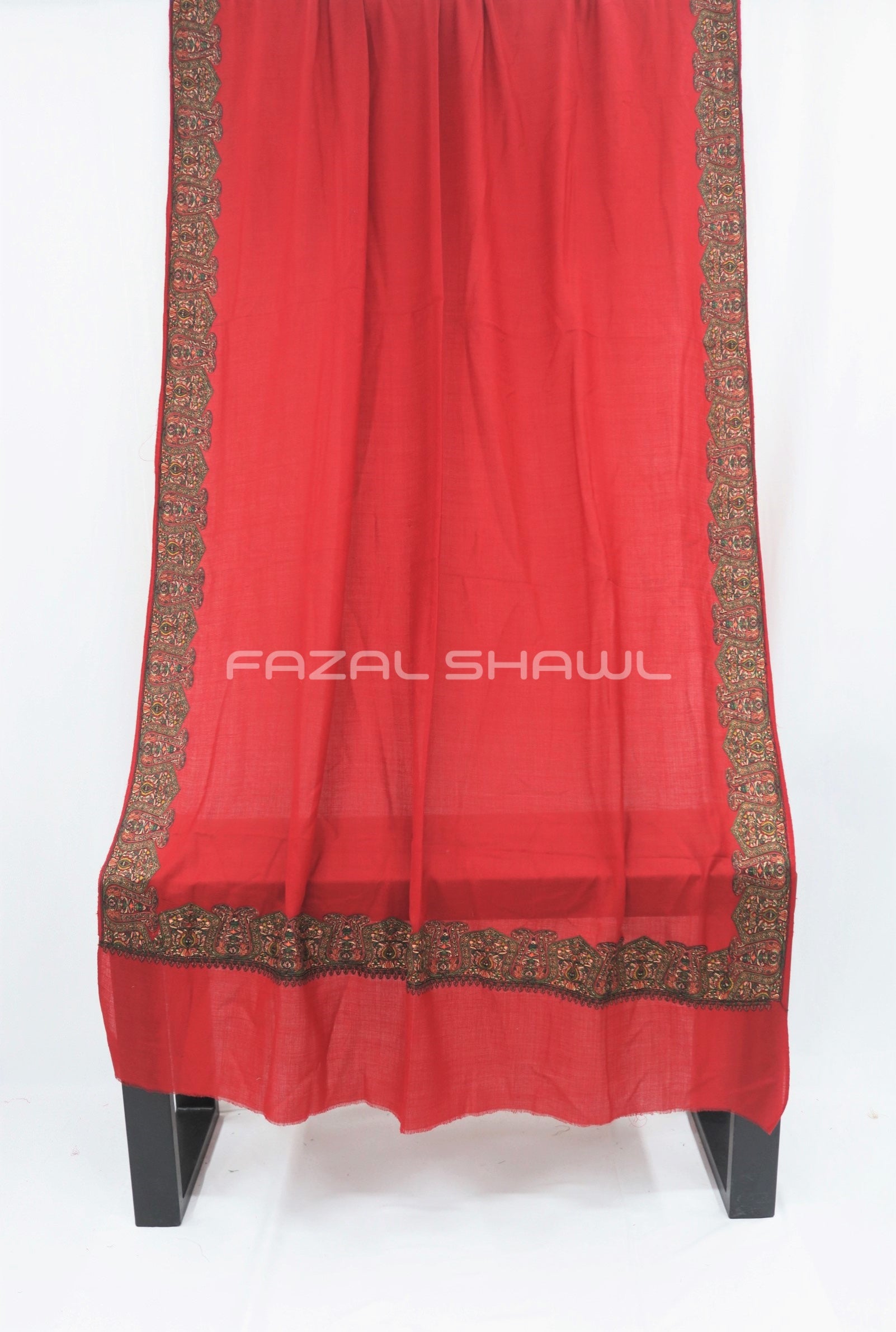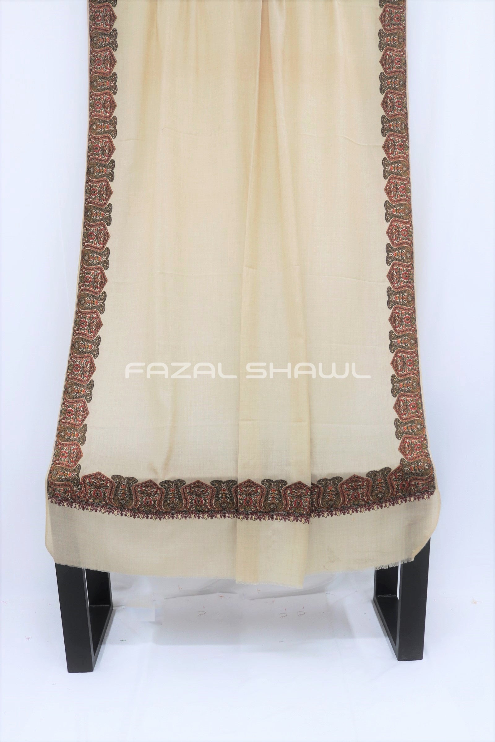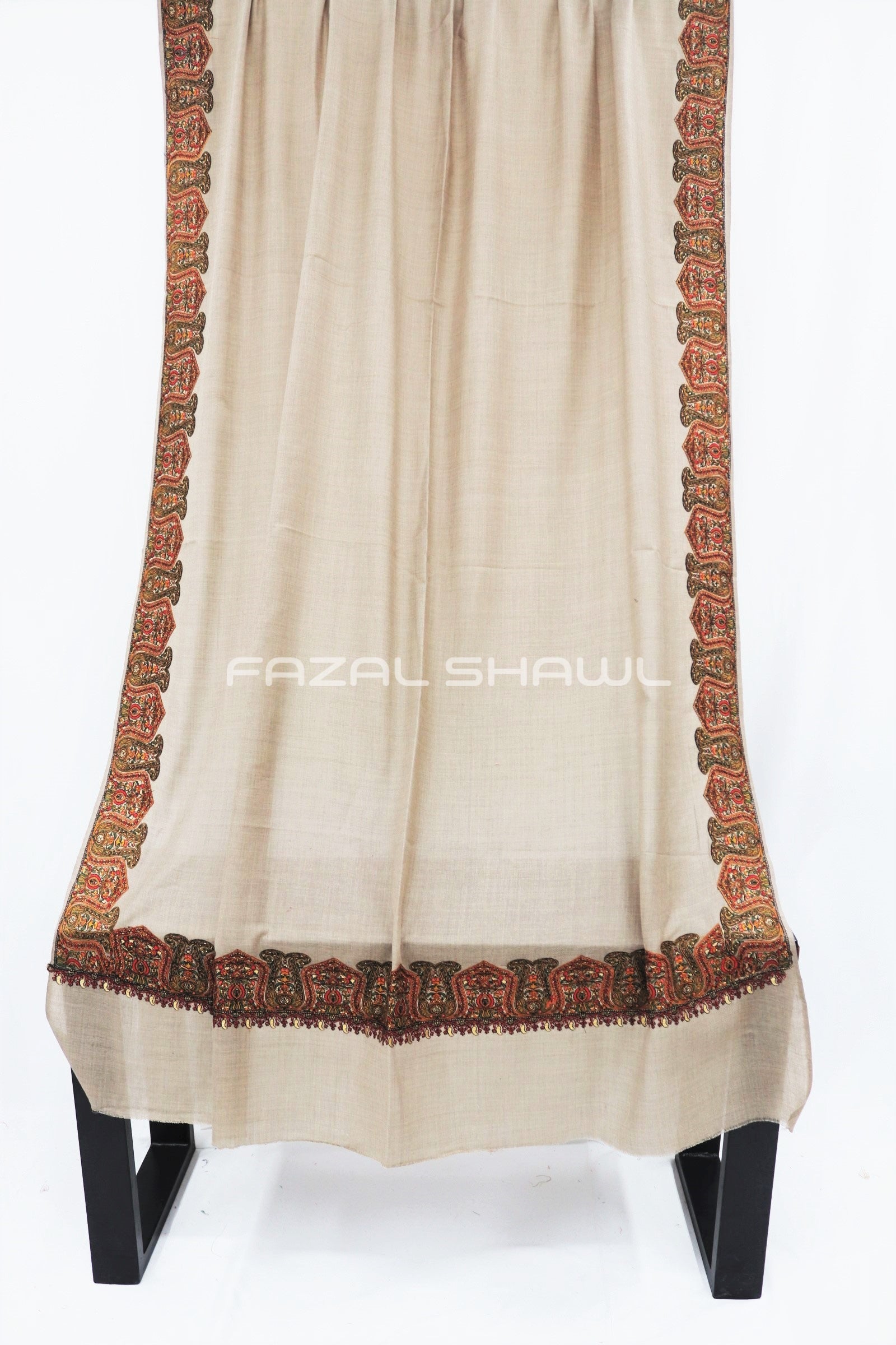 Border Size Is Four ( 4'') Inches On Four Side Border .Base is a Pashmina Wool.Top Computer Multi Border brings fine detail and flair, Paired with Fazal Shawl, it’s a luxurious wear. Perfect for those who seek style with grace, A must-have piece at our Fazal Shawl place!