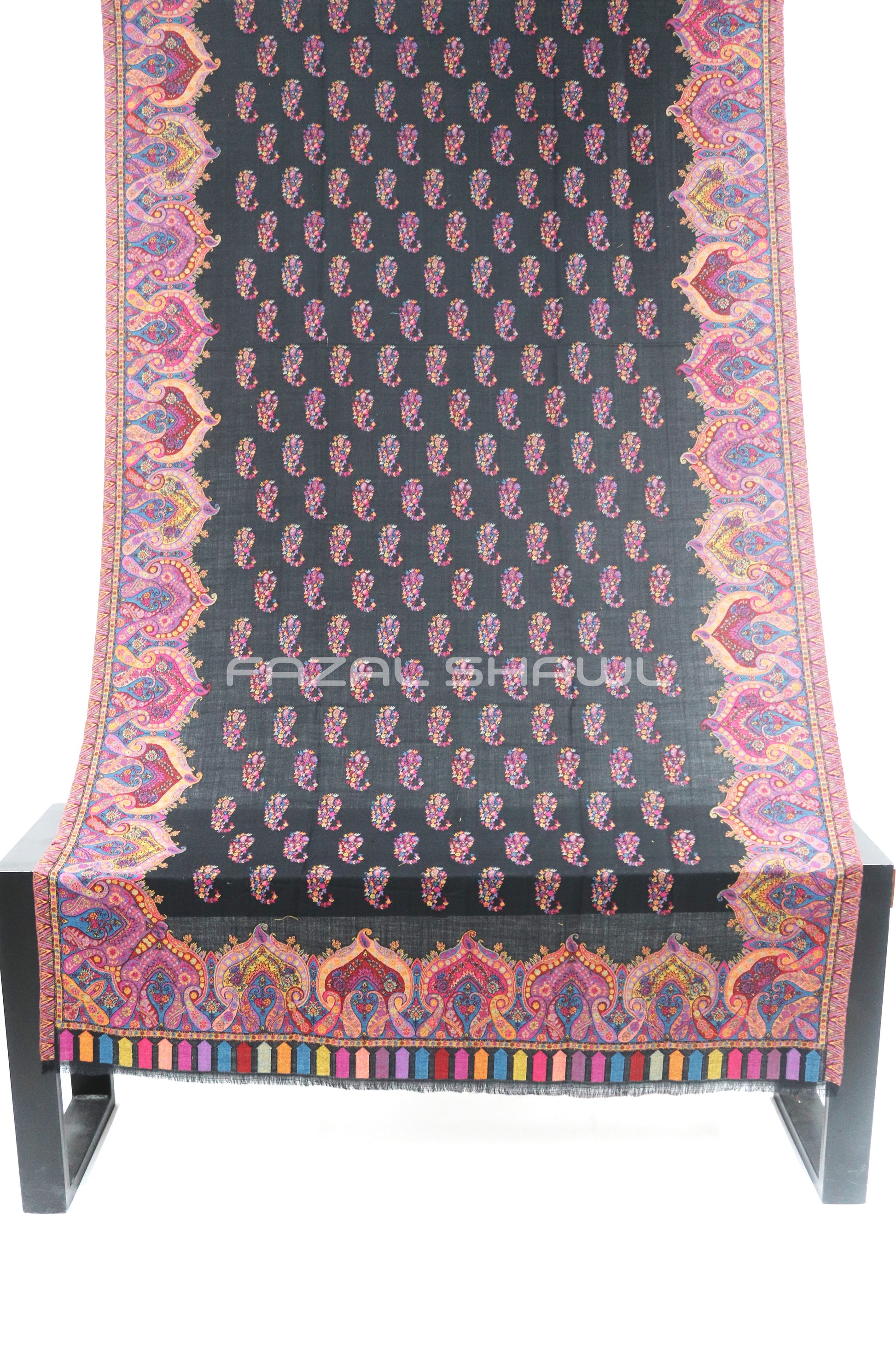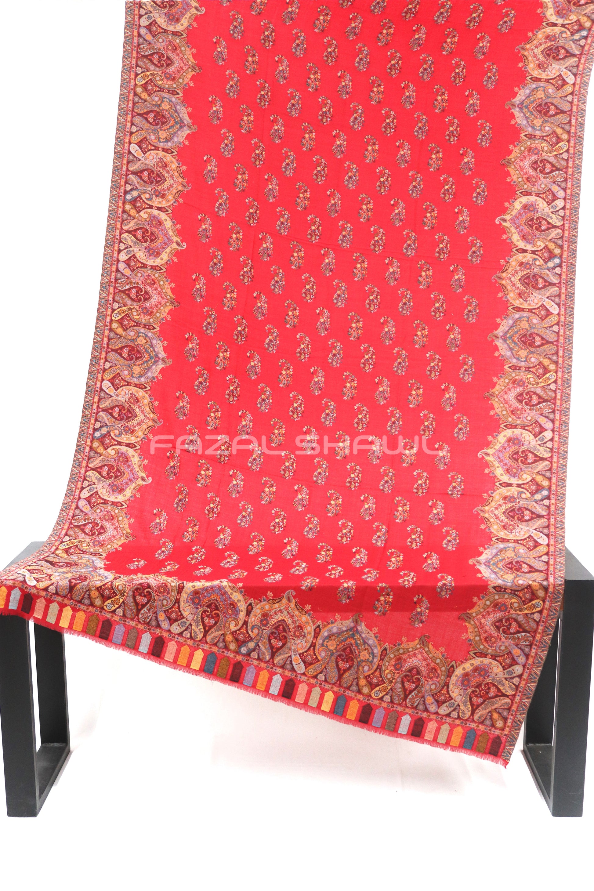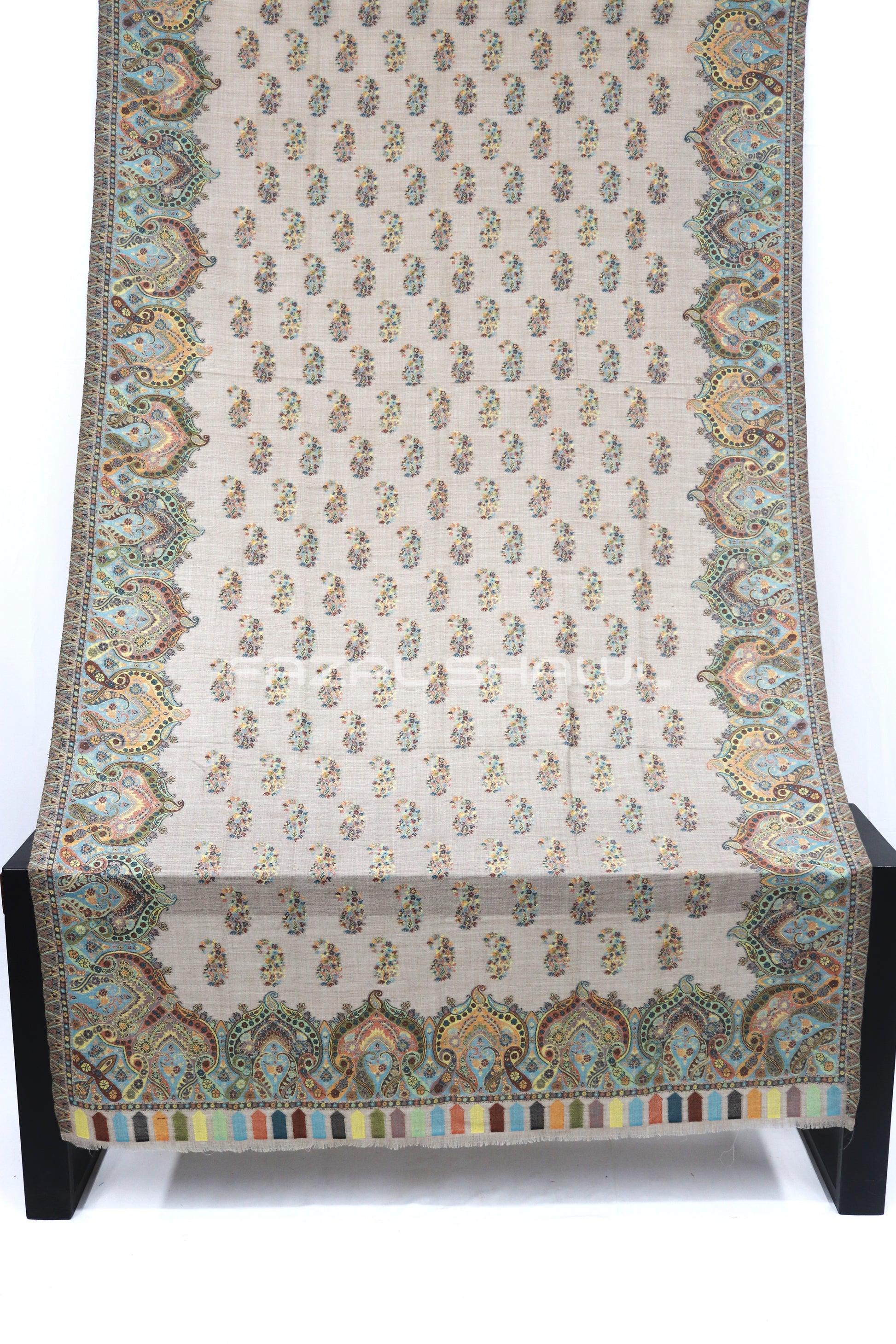 This exquisite shawl features the iconic Kaani weave, where each thread of the design is handwoven using tiny wooden bobbins (kanis), making the motifs a permanent part of the fabric. The Rajasthani Kaani Border Shawl is not embroidered—it's created entirely on the loom, thread by thread, showcasing unparalleled precision.