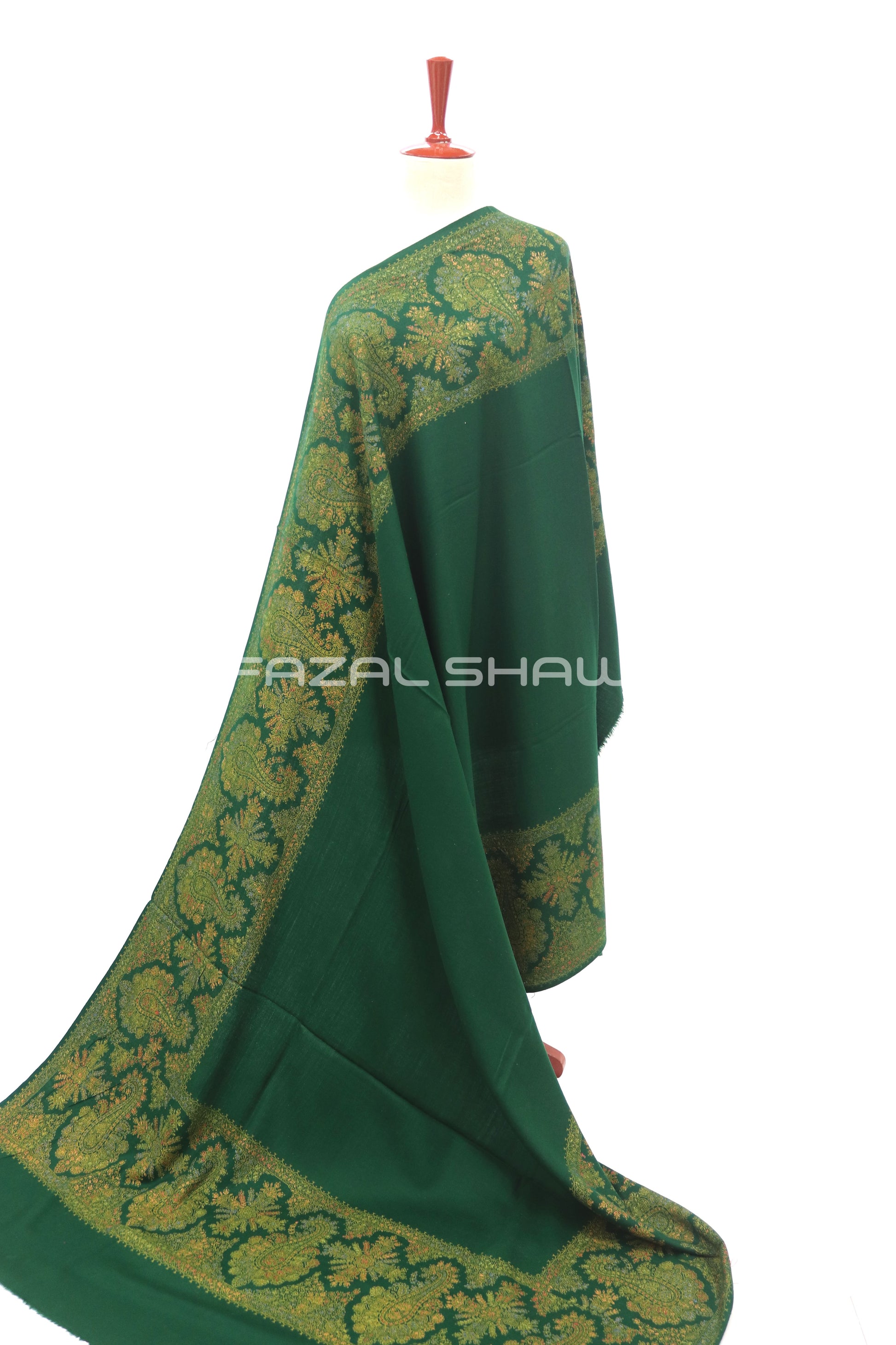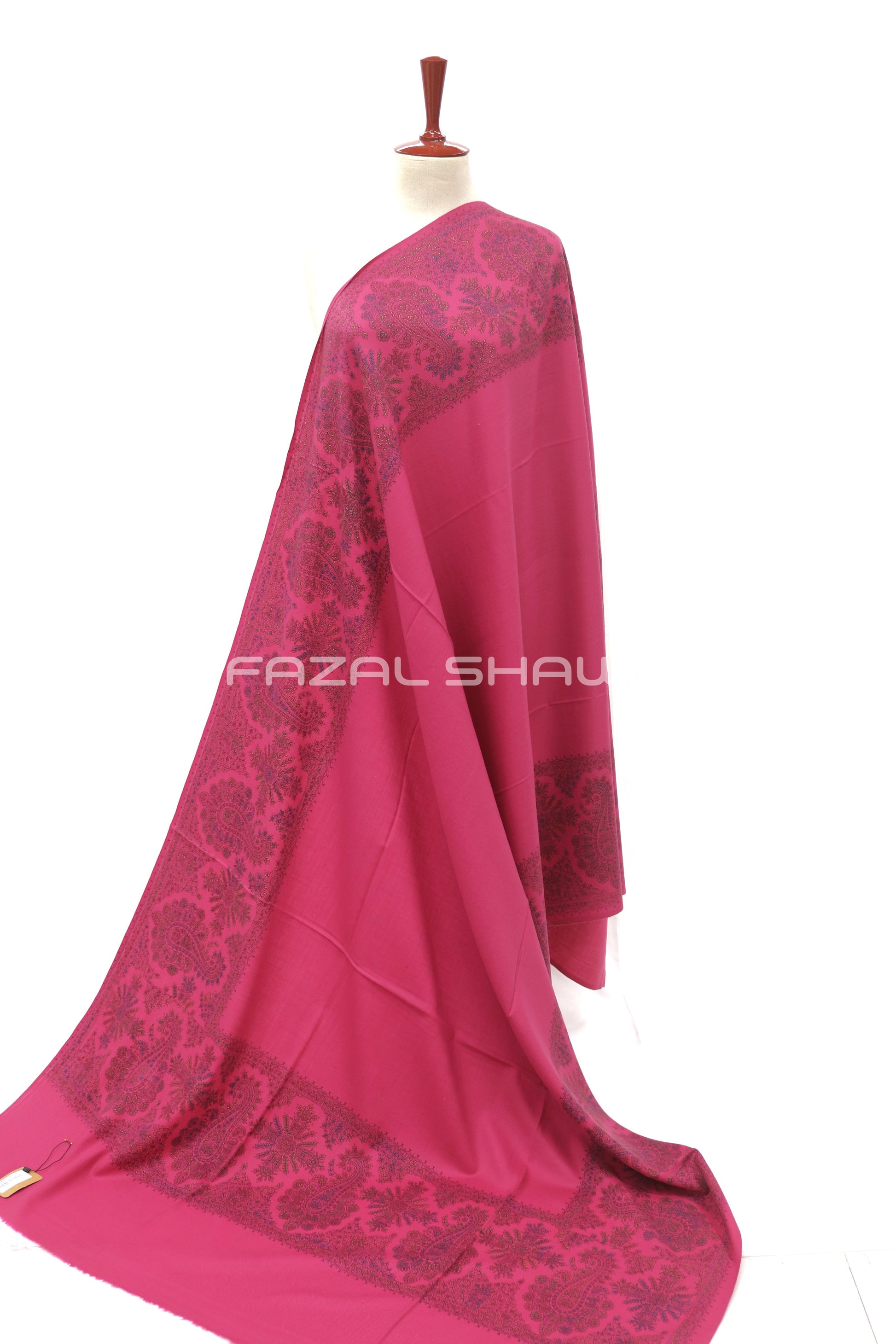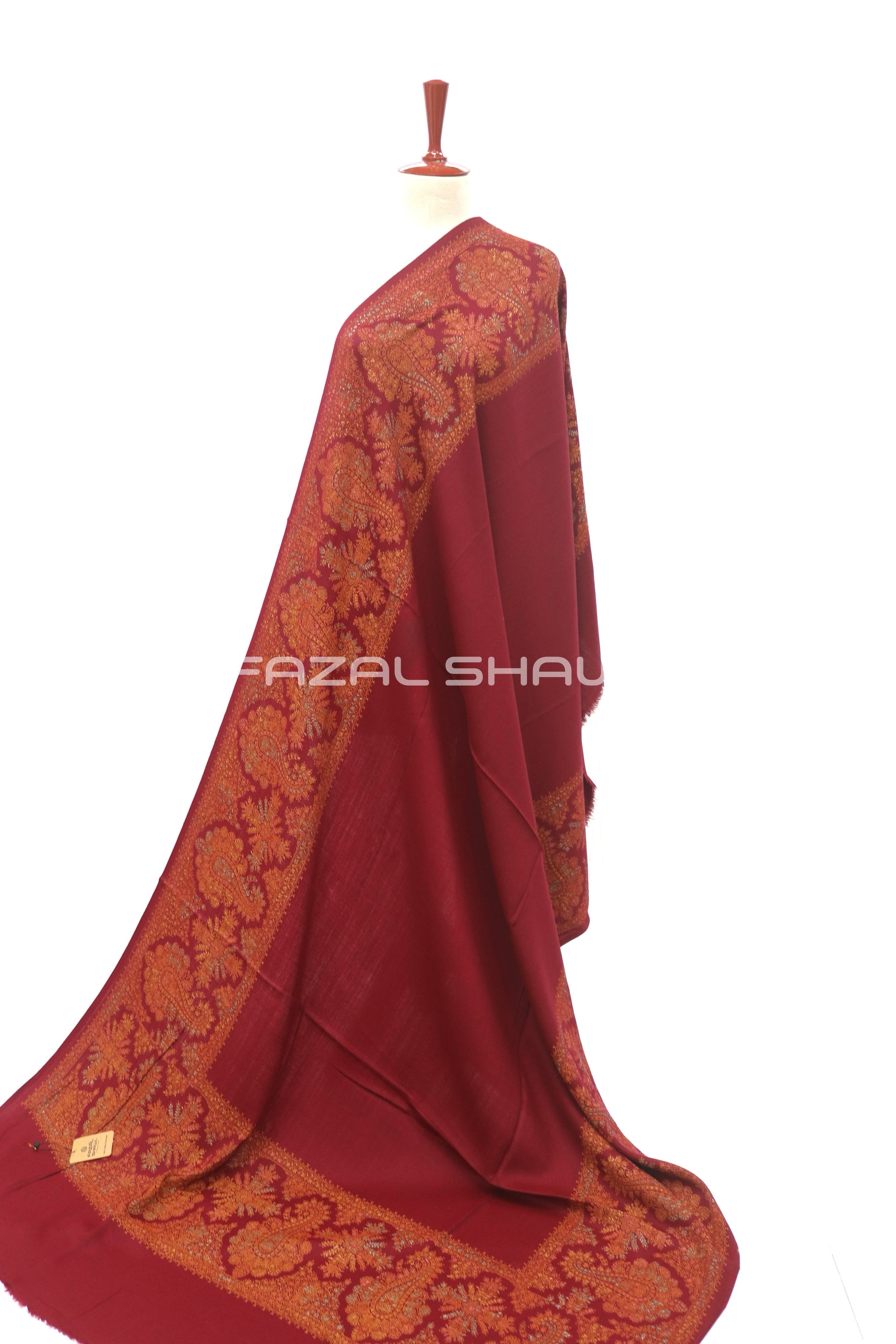 Rich and dense embroidery covering the border and both pallas of the shawl. Traditional Kashmiri motifs crafted with fine threadwork and skilled precision. Focus on symmetry, vibrant color blending, and intricate detailing. High-quality finishing ensuring durability and premium appearance. Final product to meet design standards and pass detailed quality checks.