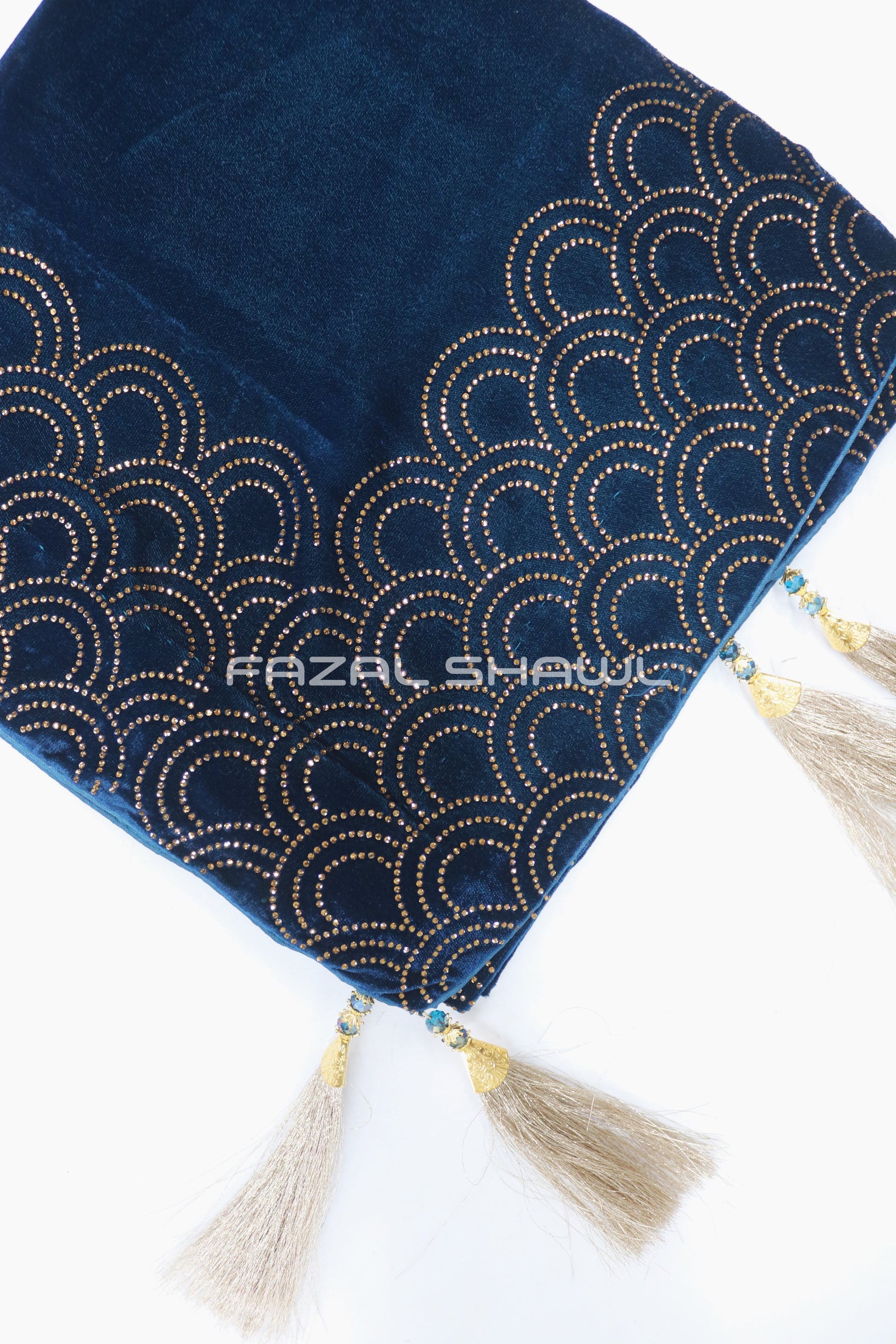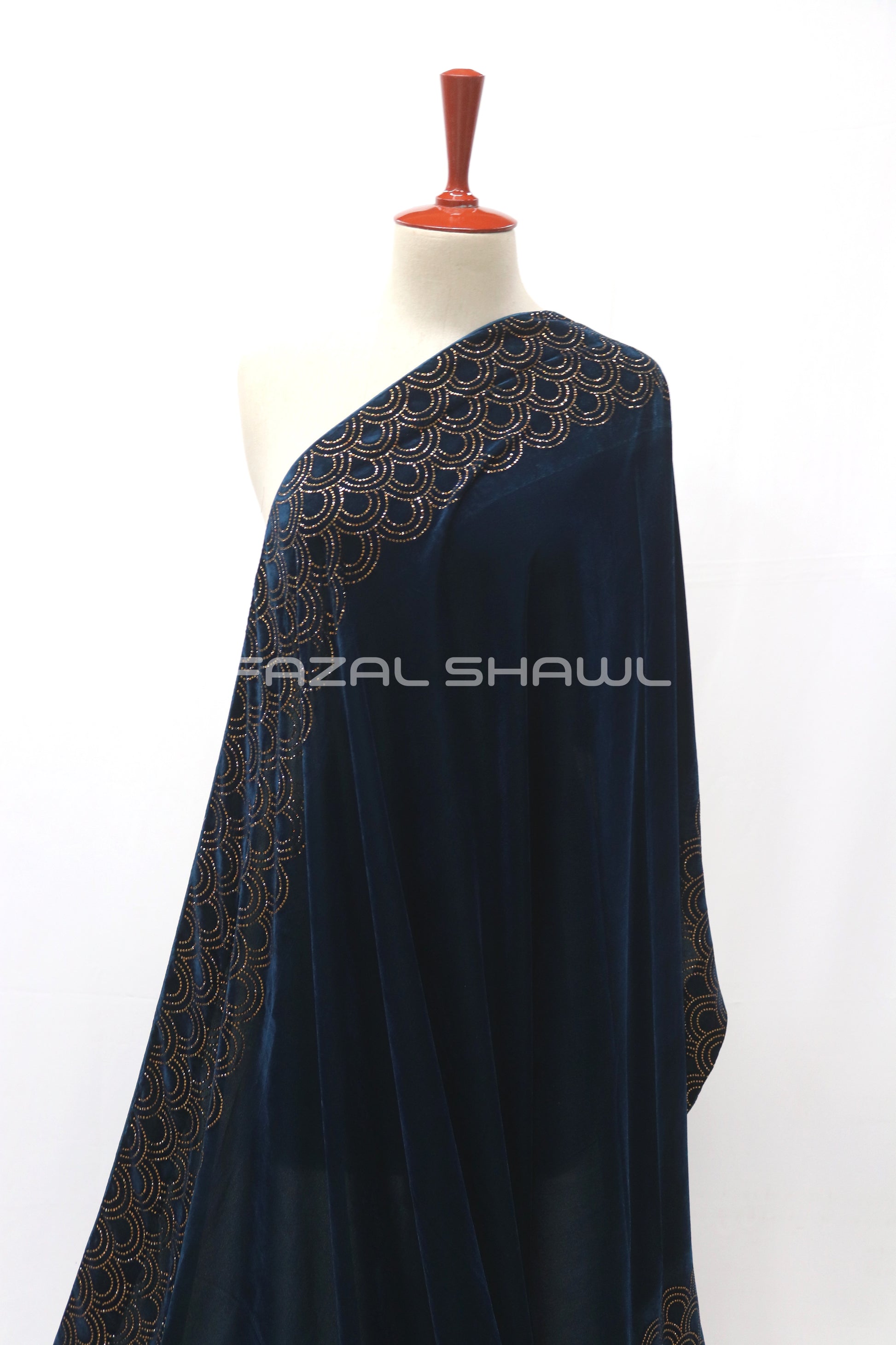 The “Stone Velvet” shawl by Fazal Shawl features a luxurious premium velvet body, selected for its rich texture, deep colour saturation, and soft drape. Along the border (and optionally across accents of the body) are hand-embellished stone-work details — flat crystals or fine stones that catch the light and add regal glamour to the piece. The velvet base ensures that the stone embellishments stand out beautifully, creating an opulent finish. With neatly finished edges and reinforced backing behind the stone-work, the shawl is designed for both stunning appearance and lasting wear.