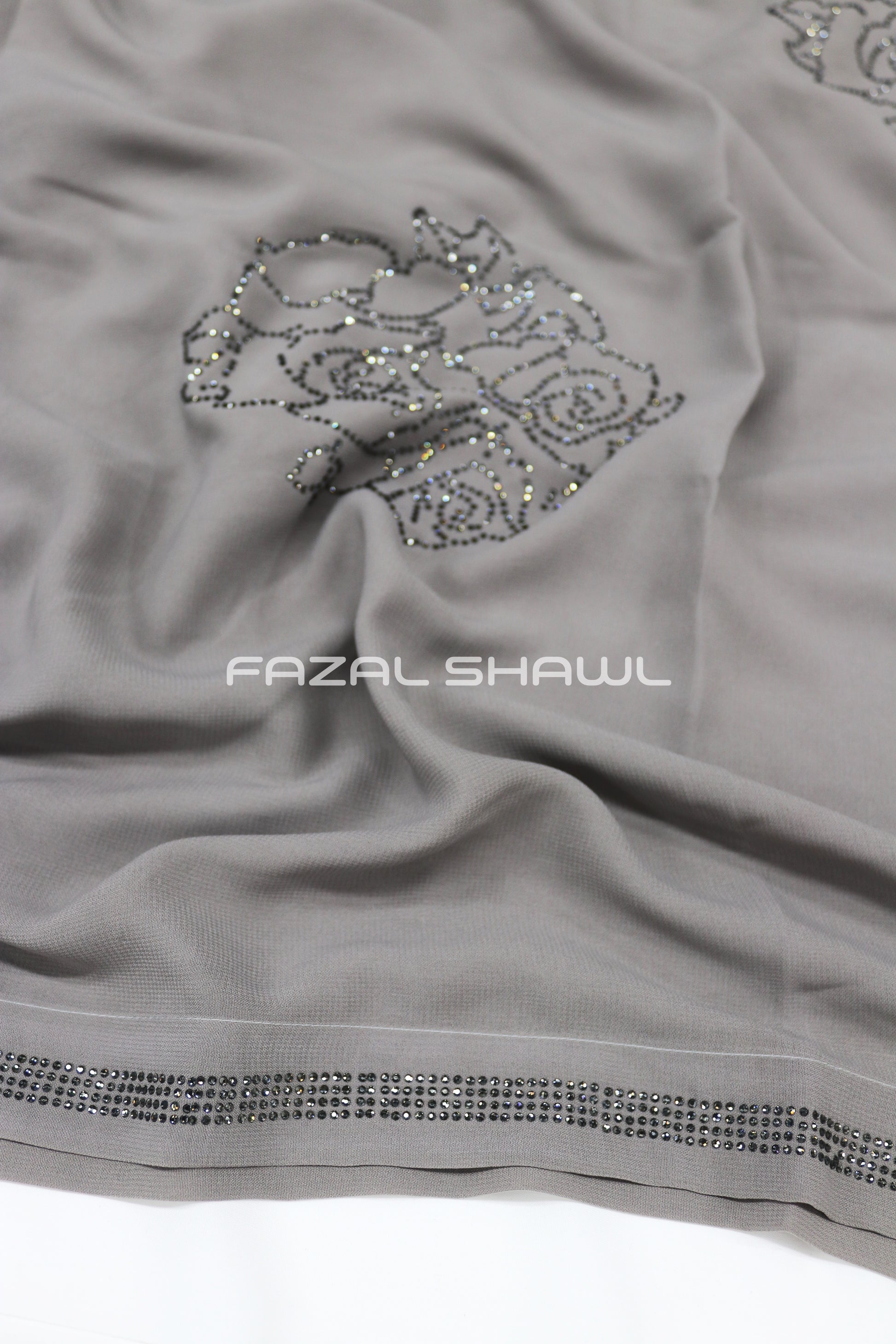 Sparkling Floral Motifs: The body of the shawl is adorned with large, scattered rose patterns created using glittering stone work or fine metallic sequins. These motifs capture the light, adding a subtle shimmer to the garment.