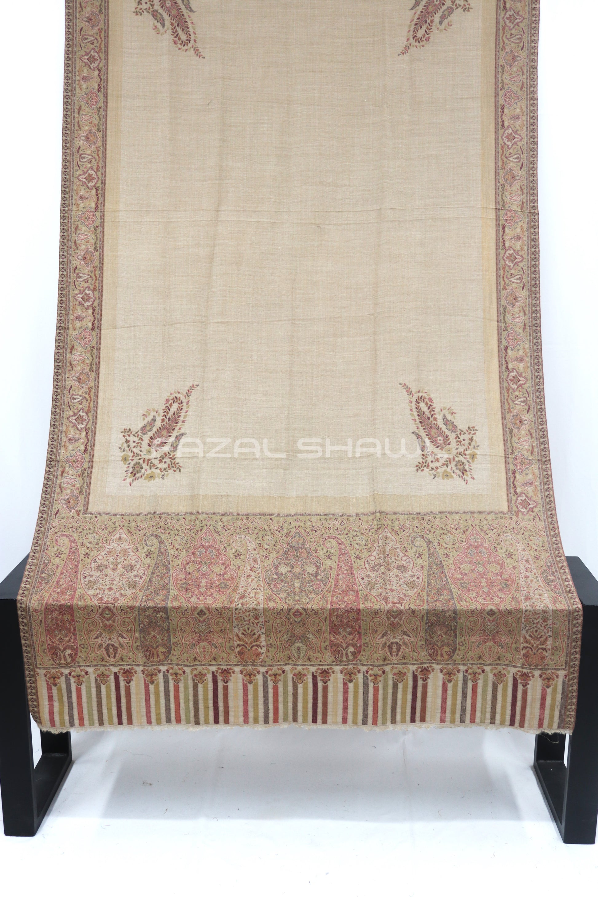 Craft & Weave Fully hand‑woven using the traditional Khani / Kani weaving technique, this shawl’s motifs are woven thread by thread with small wooden kanis. The weave is dense yet soft, ensuring durability and that lovely weight that vintage pieces have.