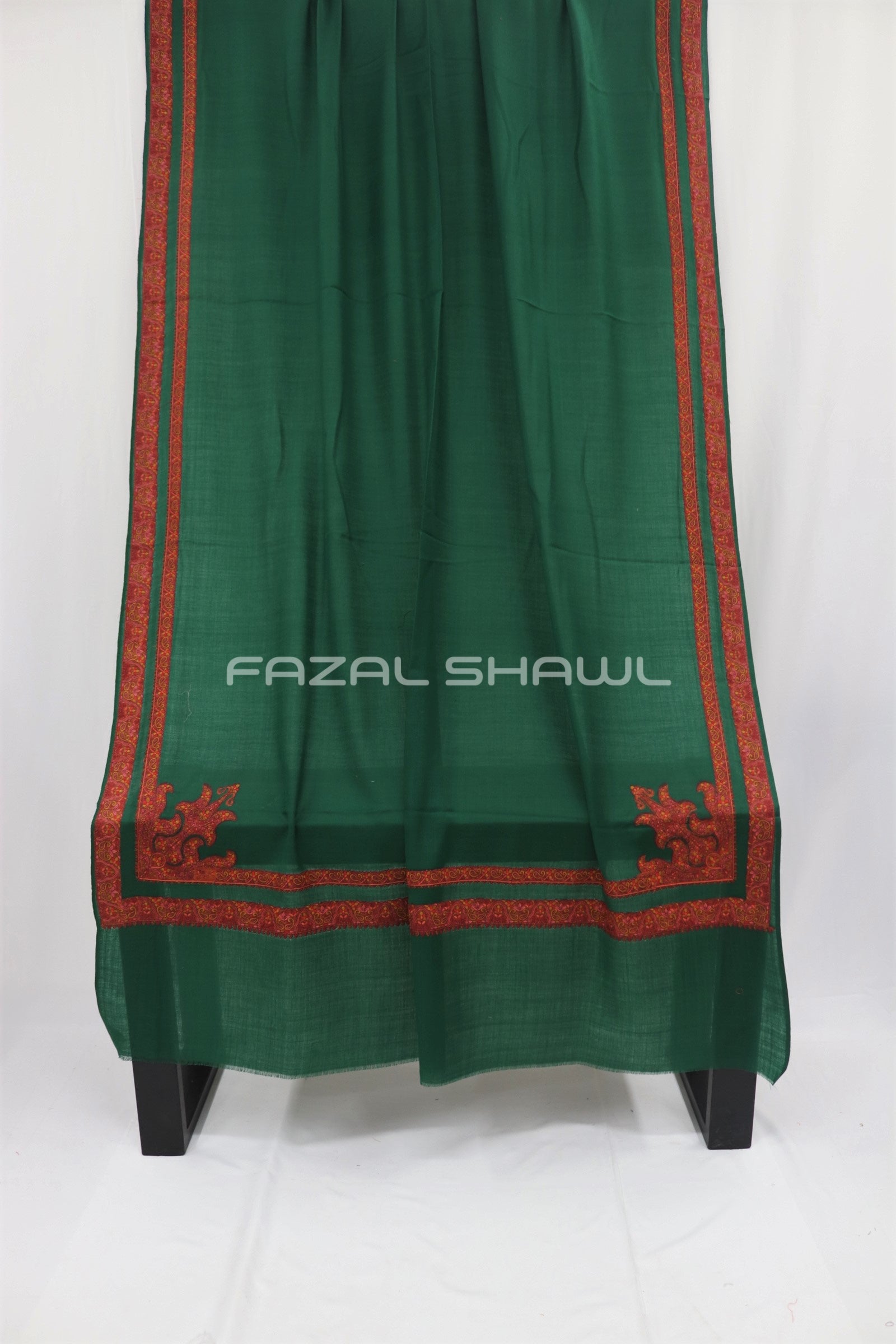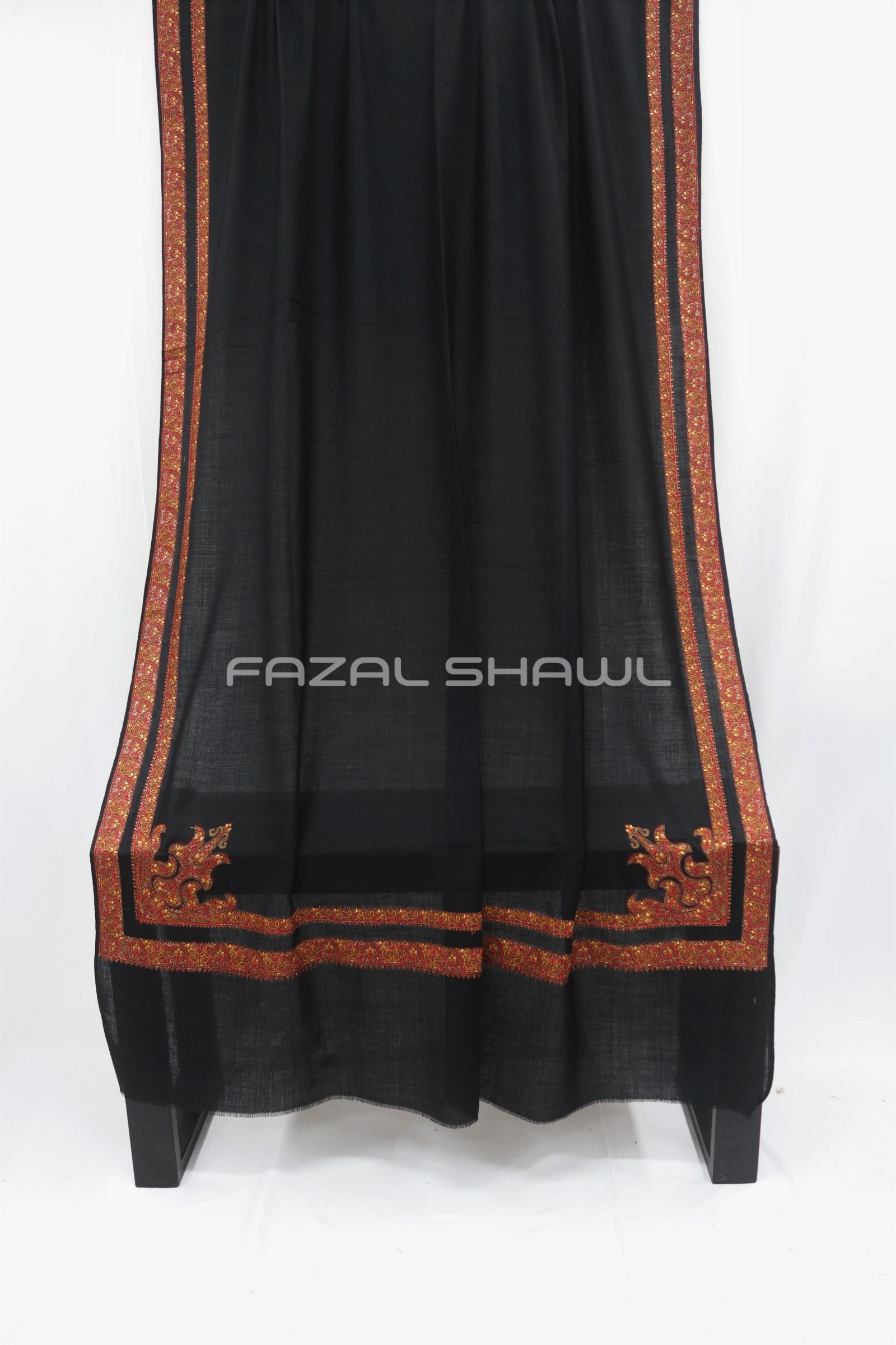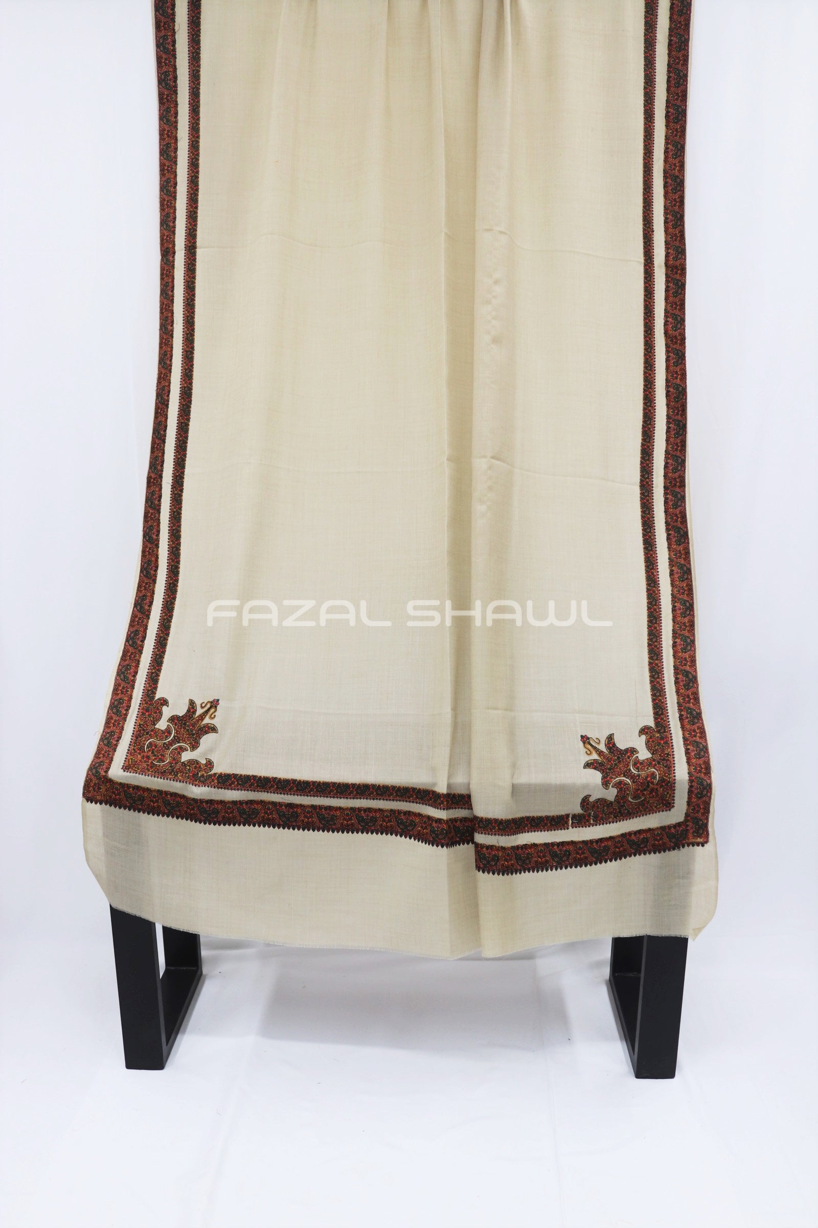 Border Size Is Two and One Point Five Duble Border design ( 2 &1.5 '') Inches On Four Side Border .Base is a Pashmina Wool. Multi Double Border adds richness and style, Fazal Shawl completes with warmth all the while.A graceful match of tradition and trend, Perfect for every season, every blend.