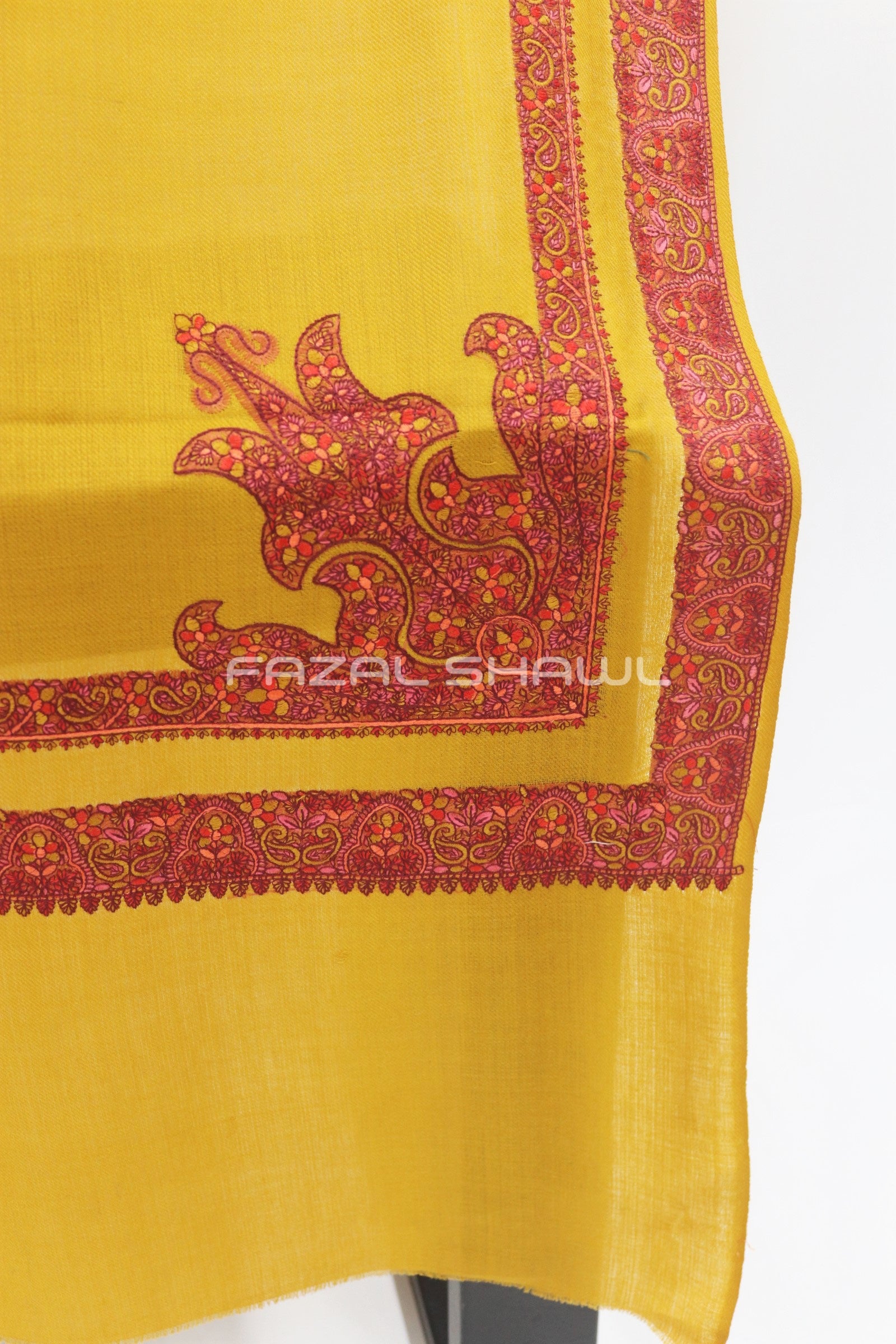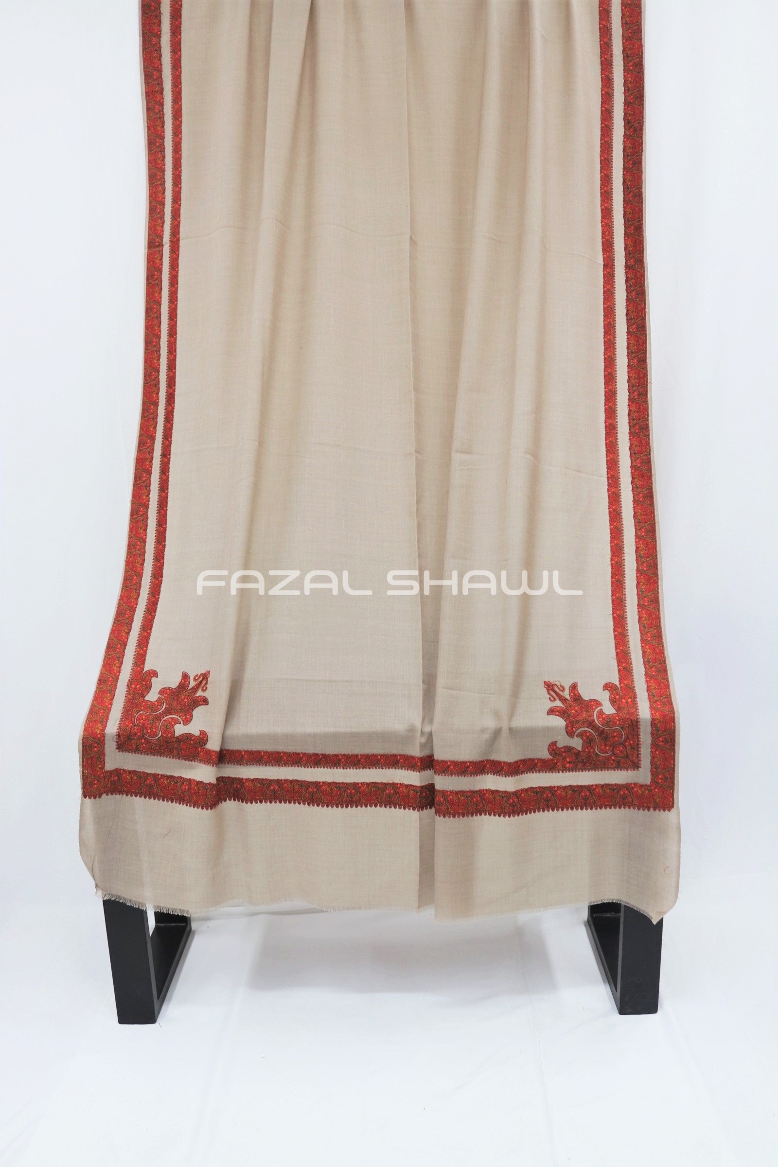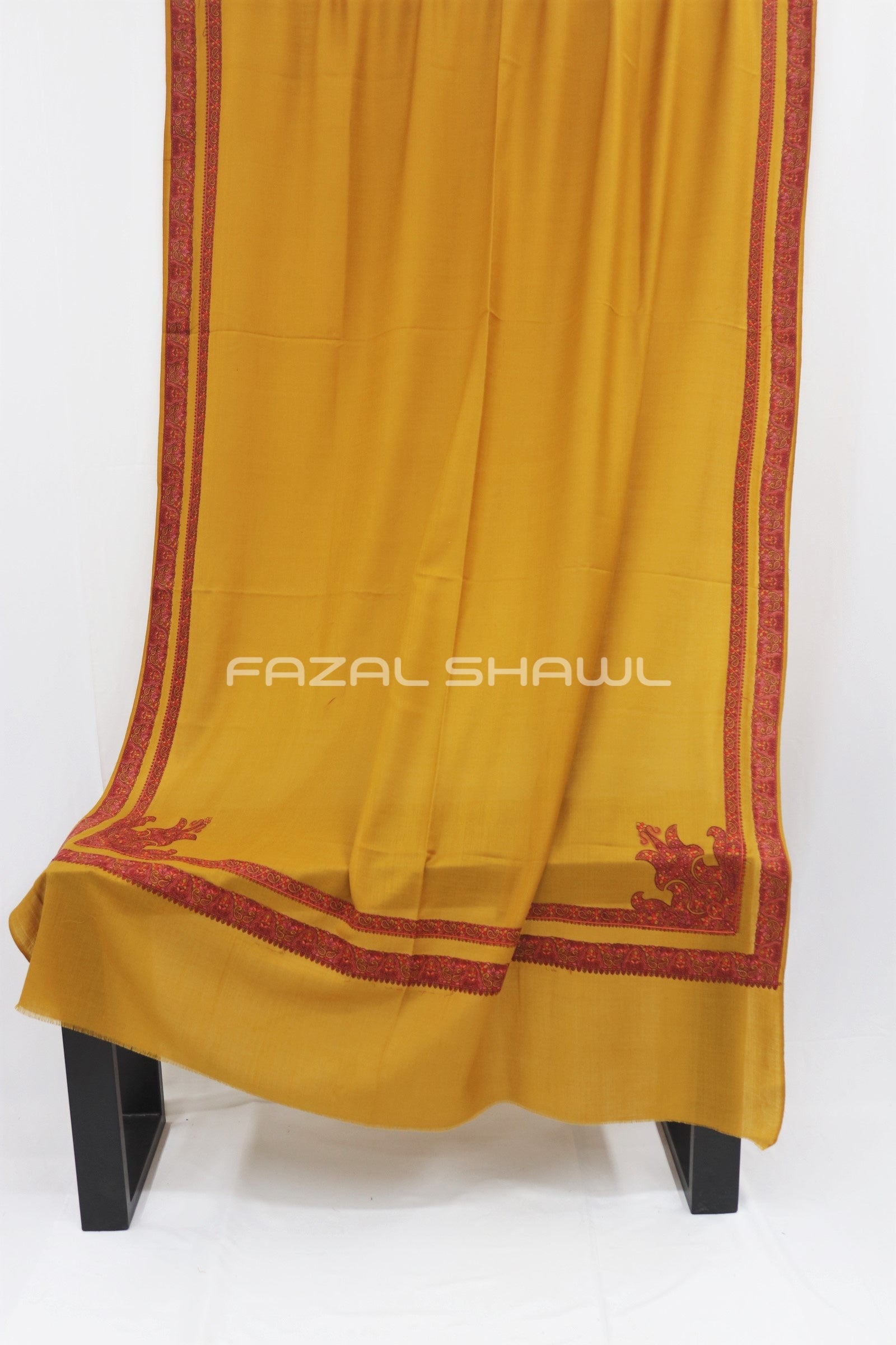 Border Size Is Two and One Point Five Duble Border design ( 2 &1.5 '') Inches On Four Side Border .Base is a Pashmina Wool. Multi Double Border adds richness and style, Fazal Shawl completes with warmth all the while.A graceful match of tradition and trend, Perfect for every season, every blend.